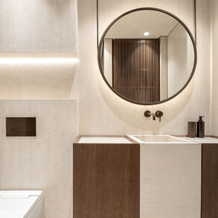 עבודת נגרות: ארונות אחסון, חדר רחצה וקיר טלויזיה.